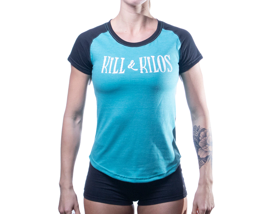 Remera combinada "K&K4". Color turquesa y negro. Tela jersey 24-1 Jaspeado. Talle estampado.