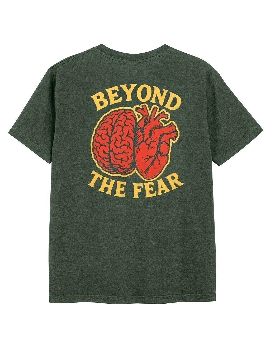 Remera oversize "beyond the fear". Color oliva. Tela jersey 24-1 Jaspeado. Talle estampado.